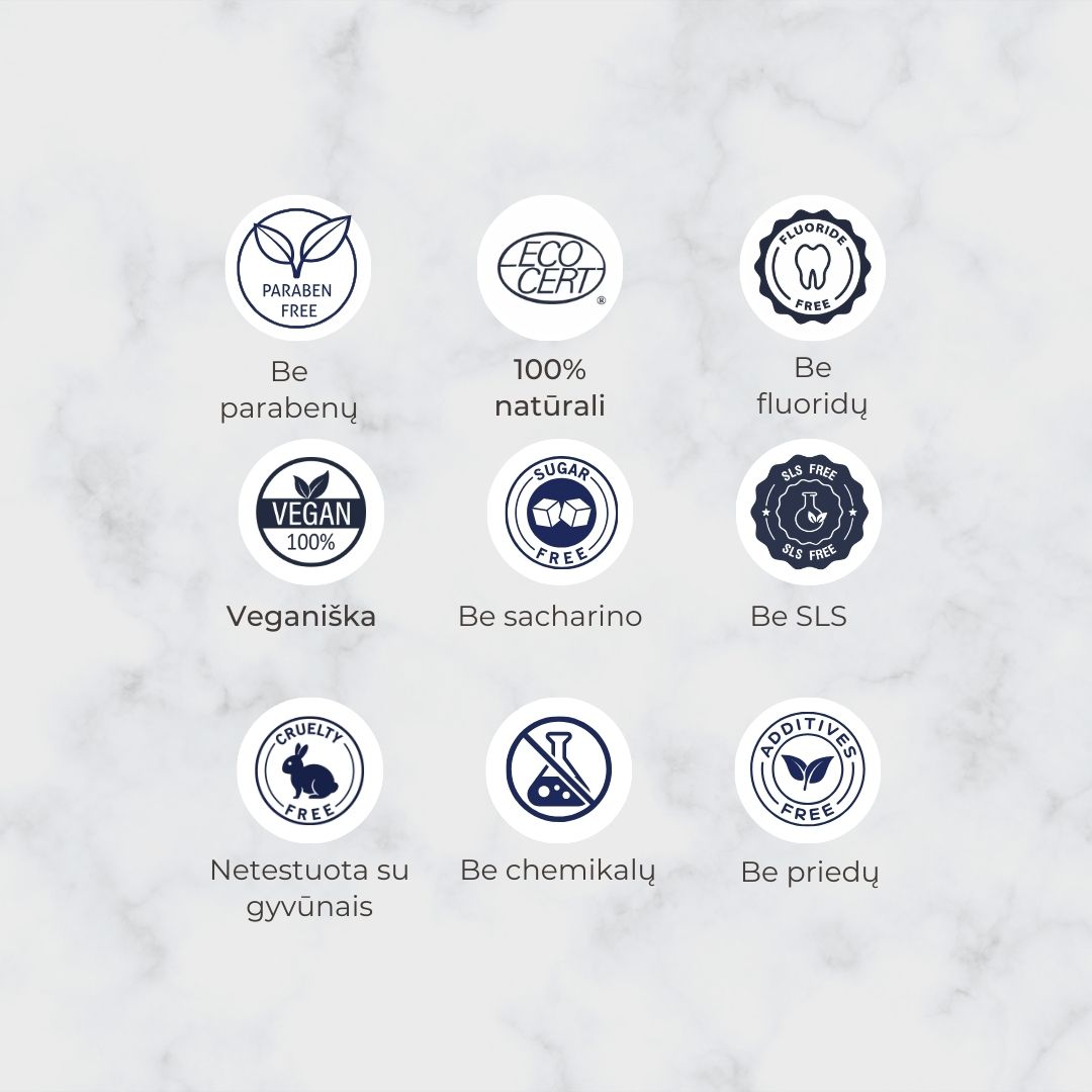 Be fluoro, SLS, parabenų ir sintetinių priedų.